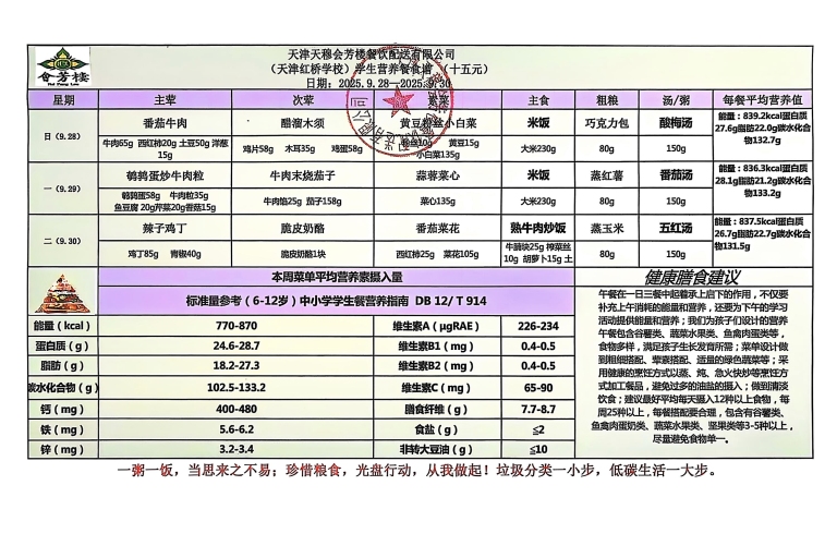 天津市红桥学校2025-2026(一)第五周食谱公示