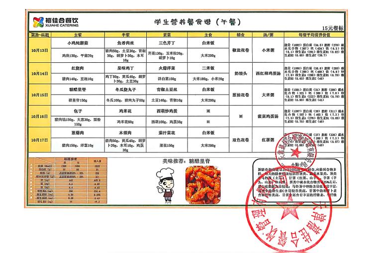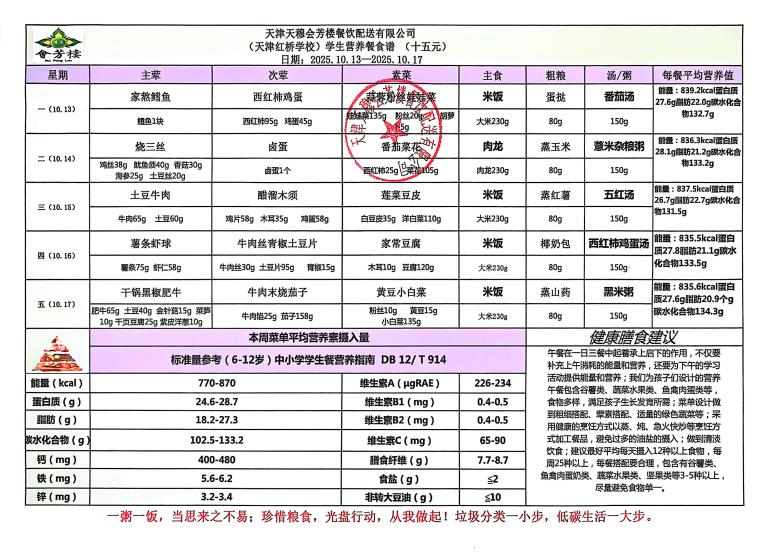 天津市红桥学校2025-2026(一)第七周食谱公示