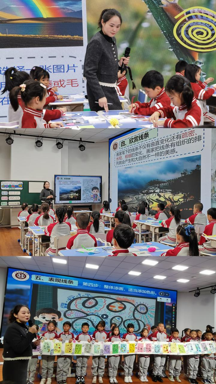 三地教师带来三节高质量课例,将人美版教材的核心素养理念转化为生动教学实践。我校刘晓奕老师执教的一年级《欢快流畅的线》,她以生动的语言引导,将抽象的“线条”转化为学生们可感知、可创作的绘画语言。从身边的线条到作品中的线条,刘老师鼓励学生大胆想象,在她的引领下,孩子们用变化的线条勾勒出一幅幅充满童趣与创意的作品,充分展现了我校青年美术教师教学风采。
