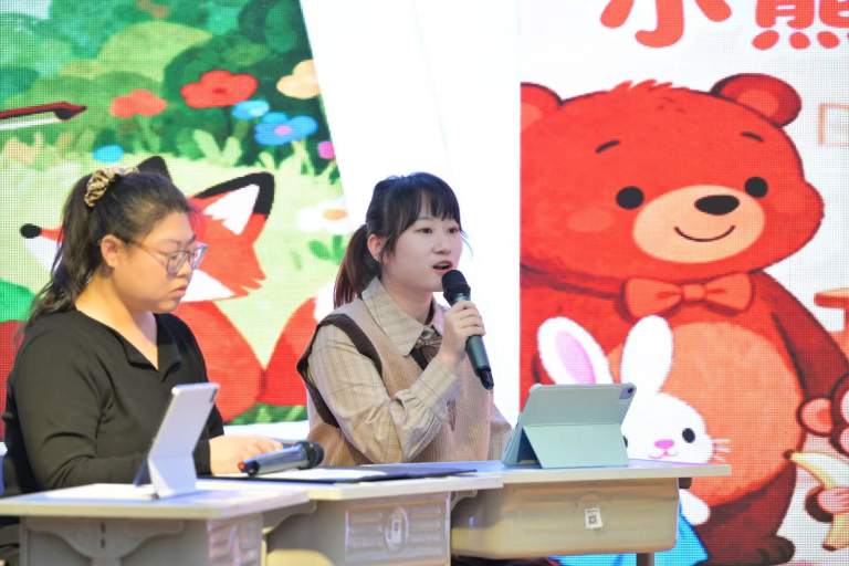 活动现场,我校钟碧云老师在特色校本沙龙环节分享了我校的教学实践与探索。结合“群文共话,跨科实践”的教学策略,钟老师以单元总结课为切入点,详细介绍了如何通过多样化活动推动学生核心素养提升。例如在完成相关单元学习后,引导学生将《青蛙卖泥塘》等童话故事改编为课本剧,通过剧本创作、角色分配、舞台表演等环节,让学生在沉浸式体验中回顾单元知识、深化文本理解,得到了与会嘉宾的一致认可。