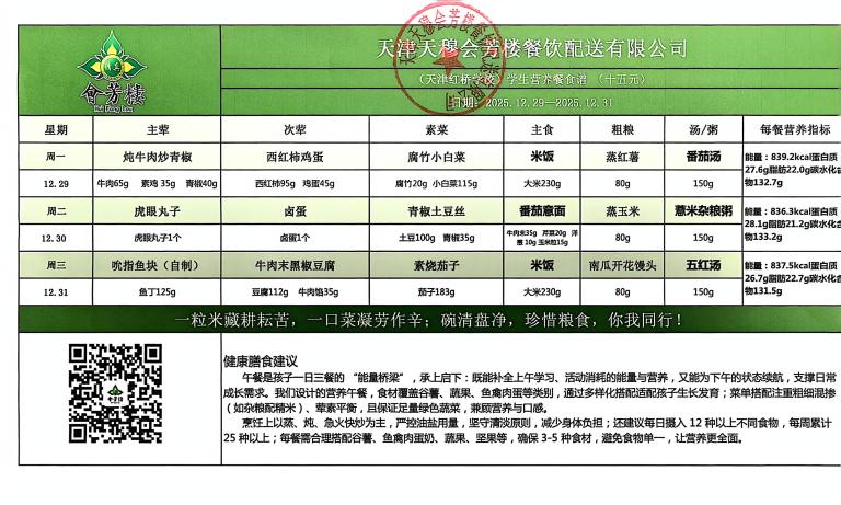 天津市红桥学校2025-2026(一)第十八周食谱公示