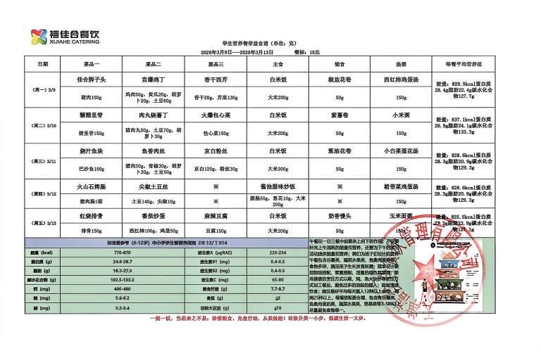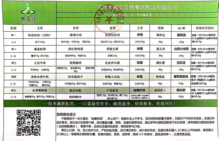 天津市红桥学校2025-2026(二)第二周食谱公示