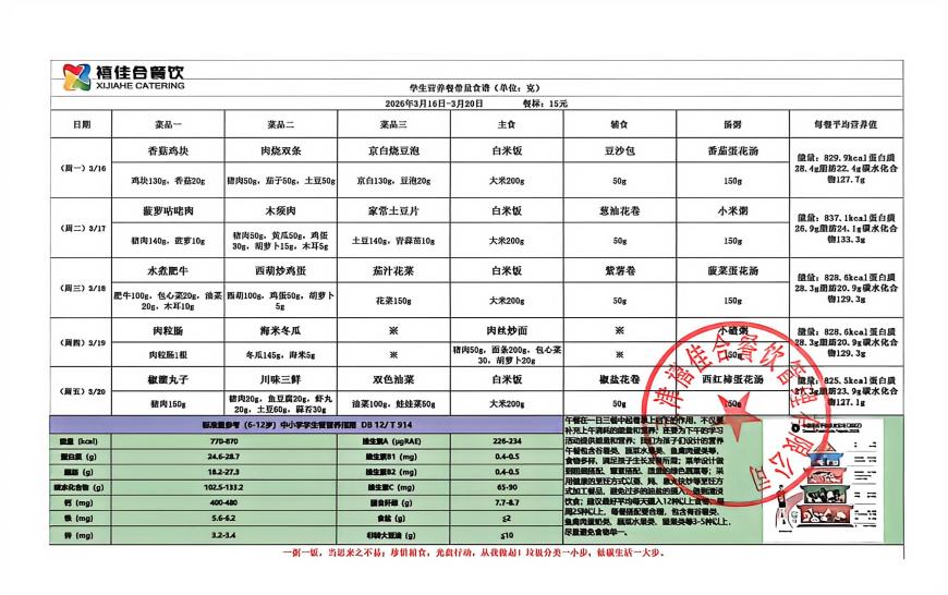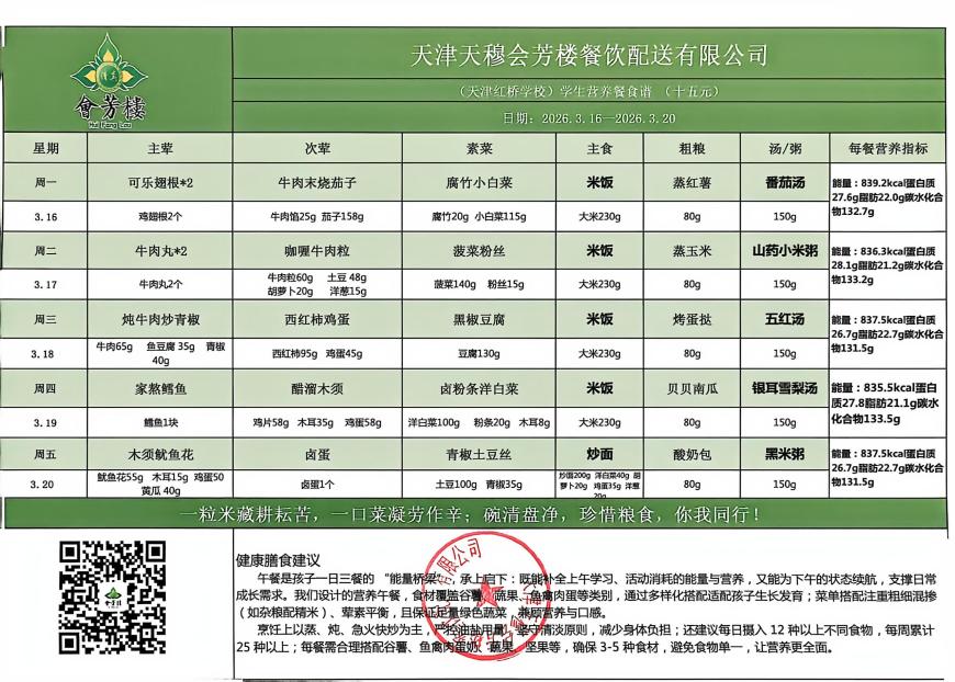 天津市红桥学校2025-2026(二)第三周食谱公示