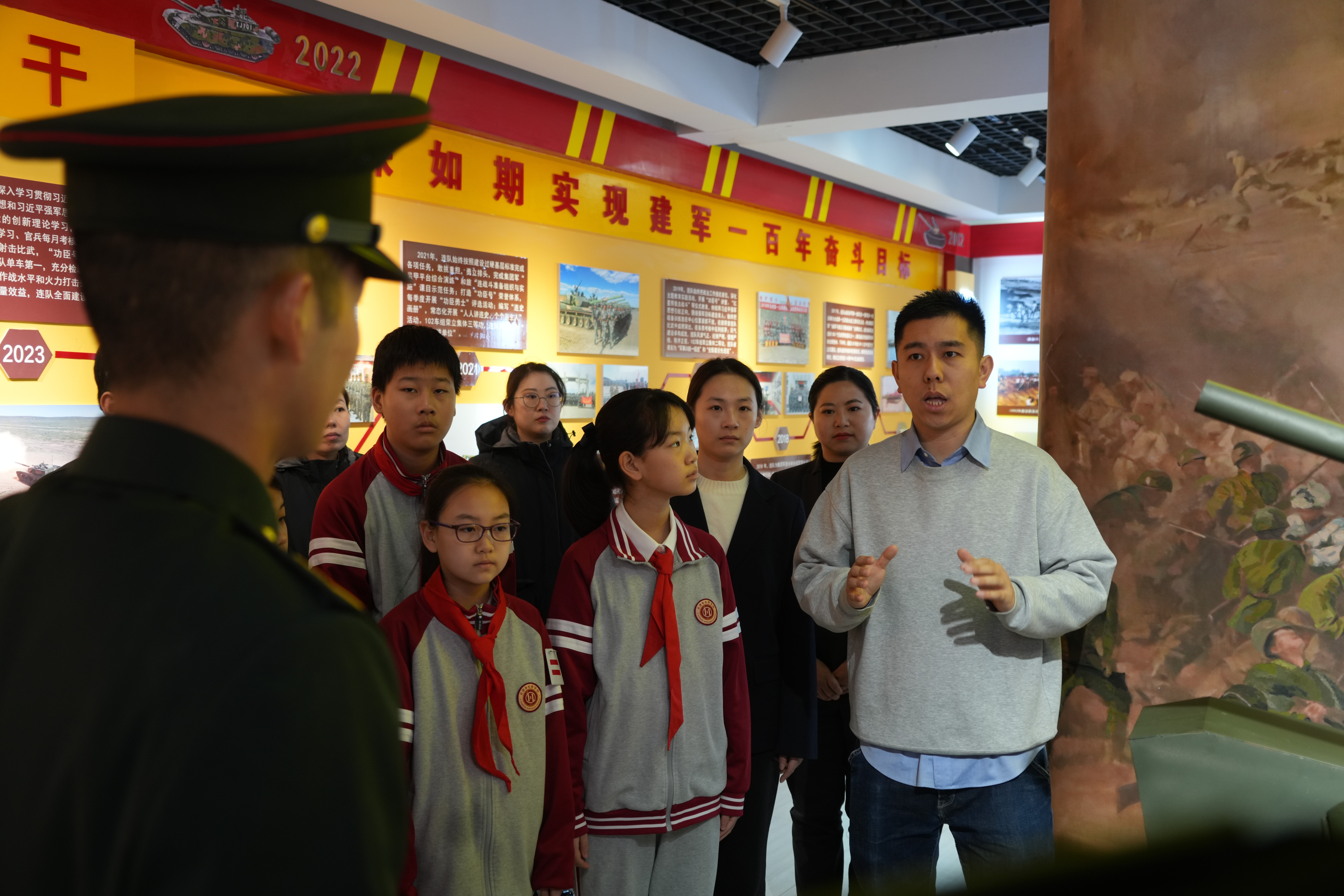 活动中,学校师生、平津战役纪念馆讲解员与新时代“功臣号”坦克连的战士们开展面对面交流座谈。战士们结合自身经历,分享在部队刻苦训练、坚守岗位、保家卫国的真实感悟,讲述新时代军人传承“功臣号”精神的责任与使命,坦言“老英雄当年敢打敢拼,现在我们一样要敢担当、敢冲锋,只不过战场变成了训练场”。